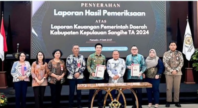 Penyerahan dilakukan pada Kamis (19/6/2025) di Aula Kantor BPK Perwakilan Sulut, dan diserahkan langsung oleh Kepala BPK Perwakilan Sulut, Bombit Agus Mulyo, kepada Bupati Kepulauan Sangihe, Michael Tunghari, dan Ketua DPRD Sangihe, Ferdy Sondakh.